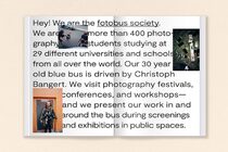 The Fotobus Society, set up by Christoph Bangert, is a network that connects more than 400 photography students from 29 German and European universities and photography schools. Members can avail themselves of a wide range of cultural and social activities offered by the association. At the heart of the community is a 30-year-old bus serving as a mobile photography school that regularly carries members to photo festivals, symposia, and professional events. Over the last years, the association has firmly established itself as a promoter of cultural and academic exchange within the international photography scene.