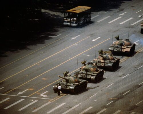 1989 年 6 月,天安門廣場上出現一名手提購物袋的男子,獨自站在了坦克車隊前。英國攝影師史都華·富蘭克林當時受《時代》雜誌委派,在北京飯店陽台上用相機記錄下這場驚心動魄的對峙。