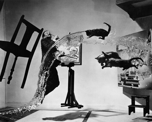 「來,準備喔——當我數到三,你們就潑水、丟貓;數到四,達利你就跳!」當時,哈斯曼帶著親自設計的 4x5 雙鏡頭相機、動員了四名助手與自己的妻子,透過鋼絲將椅子、畫架等懸掛在空中後,下達了這項指示。每拍完一張照片,他們都會立刻衝進暗房檢視成果。