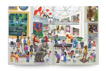 Every spread features a busy, double-page illustration of a different room packed with art, artifacts and all sorts of visitors. As children explore the Great Hall, the Dinosaur, Transportation, and Ancient Civilization exhibits, the Art Gallery and Sculpture Garden, as well as the Ocean Hall, they’re invited to search for Pepin, a mischievous dog who has wandered away from his owner, Carlo.