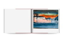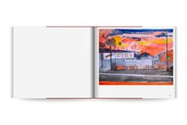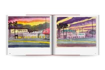The paintings, all the same motif, of people waiting in line for the gun store to open in Culver City, LA, when lockdown was announced. As the world changed dramatically that year, the paintings changed as well. When BLM protests started David added flames to the hills, then the Gun Store itself caught fire. People still waiting in line.