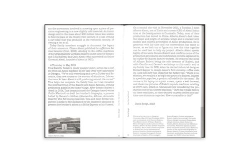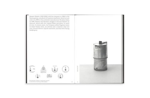 In the 1920s, in Northern Italy, the brothers Camillo, Cezaro and Alfonso Bialetti produced in their workshops aluminum household equipment. Renato Bialetti, son of Alfonso, appropriated the family brand, industrialized the production of stovetop coffee makers in the early 1950s, and sold roughly 300 million pots worldwide. Producing clones of his produc to beat competitors, the controversial entrepreneur Renato Bialetti did not deem keeping records, prototypes, or archives necessary. In this void, artist David Bergé began gathering Bialetti machines near the factory in ruins, at second-hand markets, and in flagship stores. This book is Bergé’s proposal of a Bialetti catalogue. It provides insights into the production process of a piece of precision engineering, nourished by the voices of members of the industrialist’s family, as well as former factory workers, and union representatives: Bialetti, a twentieth century icon, no longer part of every kitchen today.