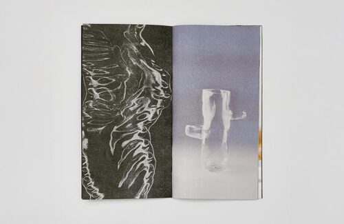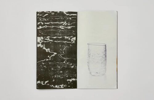 Glas documents Holz's fluid approach to texture and form, seen through the medium of Riso. Textured glassware is dragged across the glass scan bed of the Riso printer, creating an interaction between the smooth transparent and the rough translucent, that allows a glimpse into the phantasmal nature of Holz's work. When paired with photographs of the pieces, we are presented with a dialogical exploration of form and matter, blurring the lines between the solid, three-dimensional objects, and fluid flat screens.