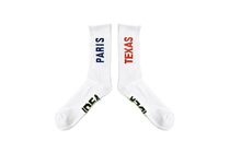PARIS, TEXAS. White organic cotton socks. PARIS on one, TEXAS on the other. Red and Blue text. IDEA in black to the sole.